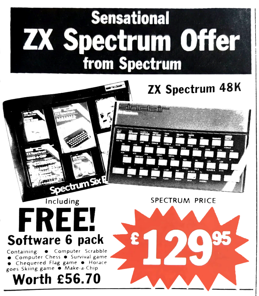 The free software bundle released with the original ZX Spectrum 48K consists of Make-A-Chip, Computer Scrabble, Survival, Horace Goes Skiing, Chess and Chequered Flag.
