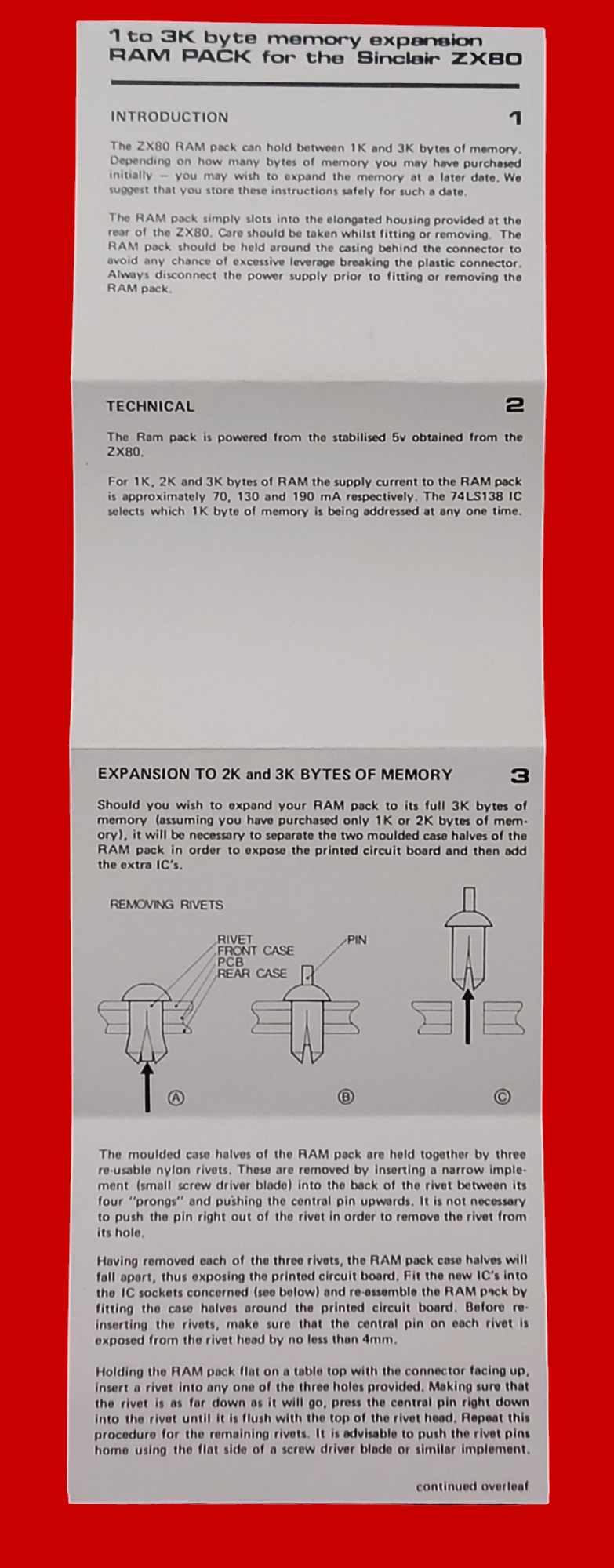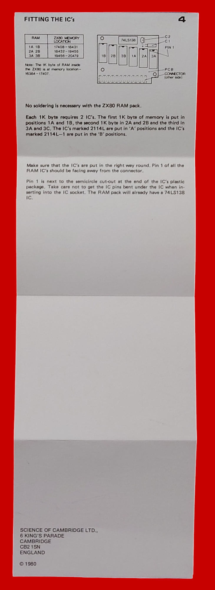 Sinclair ZX80 1–3K Byte Ram Pack Brand: Science of Cambridge Ltd.Model: ZX80 1–3K Byte Ram Pack Country of origin: United KingdomPrice in UK: £12 (unpopulated) / 1Kb chips: £16Price in NL: ƒ155,- (3Kb) The ZX80 1–3K Byte Ram Pack came delivered unpopulated. The user had to add 2, 4 or 6 RAM chips to make it work.