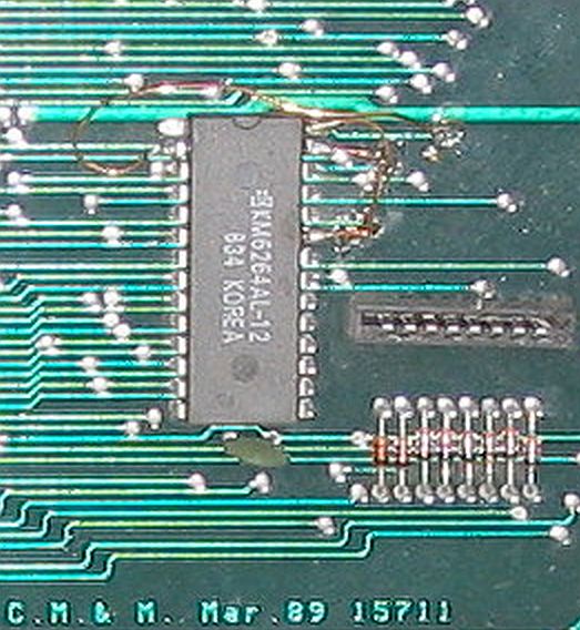 Instead of 16 Kb of RAM as previously fitted by Czerweny, these later machines had only 2 Kb (24 pin KM6264AL-12 in this CZ 1500 Plus) or 8 Kb (too large 28 pin NMC2116N-20L using bodge wires as the pinout is slightly different, seen here on the right).