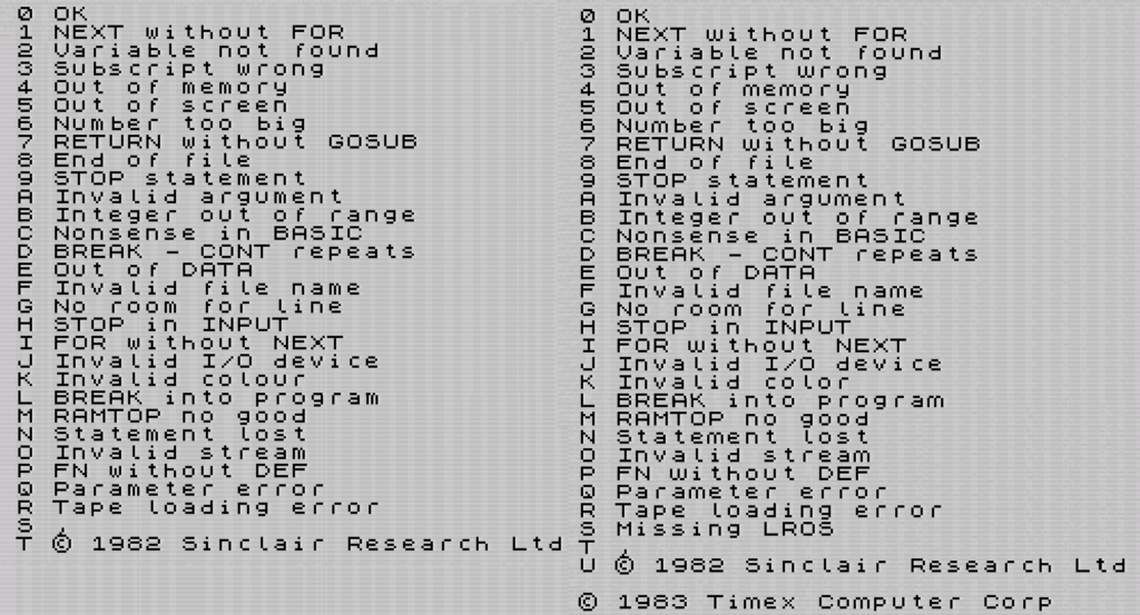 Error messages on T/S 2086 (Spectrum messages for reference):